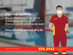 Die aktualisierte Corona-Verordnung des Landes Bremen ist mittlerweile bekanntgegeben und die Schwimmbäder in Bremen und Bremerhaven mussten mit dem 02.11.2020 schließen. In der Folge setzt auch die DLRG in Bremen und Bremerhaven Schwimm- und Rettungsschwimmausbildung bis auf Weiteres aus. Selbsterklärend sind auch alle anderen Angebote in den Bädern (Mitgliederschwimmen, Wassergymnastik u.ä.) eingestellt.